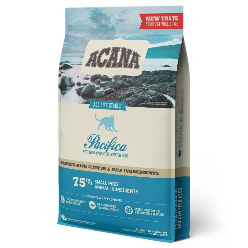 מזון יבש ומלא מותאם ביולוגית ומיועד לחתולים מכל הגזעים ובכל שלבי החיים.אקאנה פסיפיקה לחתול מבוסס על תזונה ביולוגית עם מרכיבים על פי תזונה קדמונית כפי שבעלי החיים אכלו בטבע. אקאנה פסיפיקה מכיל: הרינג, מקרל, בקלה, שיבוט אלבין, פיונית, פולוק ודג Rockfish . המזון עתיר חלבונים ודל בפחמימה ומיוצר בתהליך בישול איטי השומר על איכות הויטמינים והמינרלים. המזון איכותי, מיוצר מ-75% מרכיבים מהחי וללא דגנים.