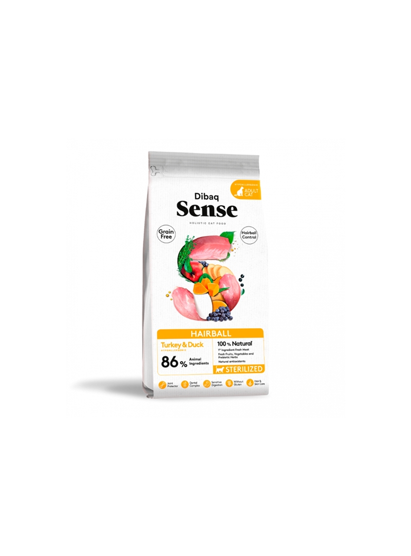 דיבאק סנס היירבול הוא מזון איכותי, מלא ומאוזן לחתול שלכם. הפורמולה הזאת ספציפית מיועדת לחתולים ארוכי פרווה הנוטים לקבלת כדורי פרווה באופן נפוץ יותר מגזעים קצרי פרווה ומטרתו לתמוך בהפחתת כדורי הפרווה. המזון נוצר באופן שיטתי ומדוייק ומרכיביו נבחרו בקפידה, ביניהם נמצאים הודו וברווז טריים, תפוח עץ, אוכמניות ודלעת בכדי לענות על שאלת הטעם של החתול ועל כל צרכיו התזונתיים. מכיל תערובת מגני מפרקים כדי למנוע כאב מפרקים ולתמוך בבריאותם, תמצית יוקה על מנת לנטרל ריחות ביציאות, עם תוספת פרי ופרוביוטיקות כדי לתמוך בעיכול תקין, תומך גם בבריאות השן. המזון הוא ללא דגנים וגלוטן כך שמהווה אופציה נהדרת גם לחתולים עם רגישויות. המזון הוא 100% הוליסטי וללא חומרים משמרים, טעם וריח וצבעי מאכל.